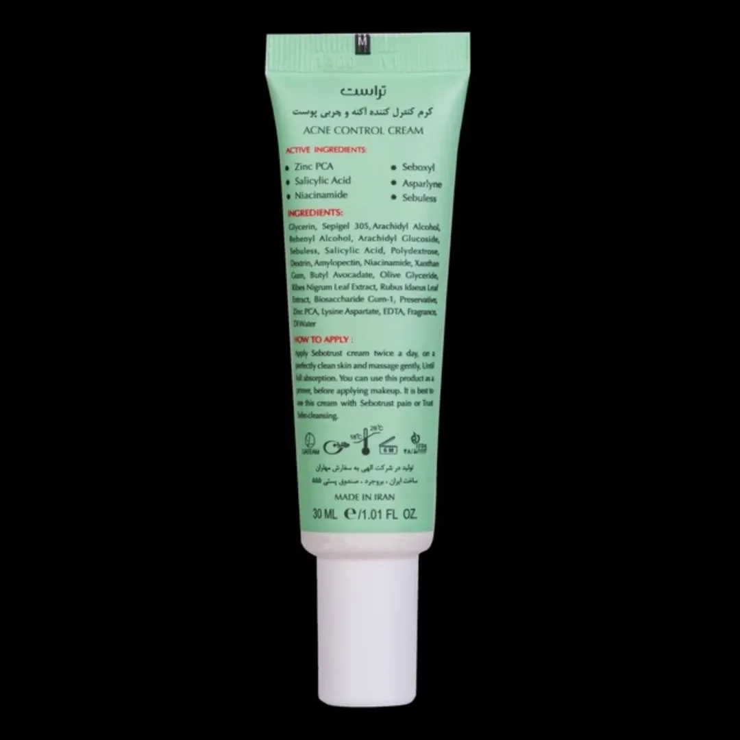 کرم ضد جوش و کنترل کننده چربی تراست، با عصارههای انگور سیاه، تمشک، بید، یاس بنفش و اسید سالیسیلیک، میتونه آکنه، قارچ و خارش پوست رو برطرف کنه، منافذ باز پوست رو ببنده و پوست رو آبرسانی کنه.