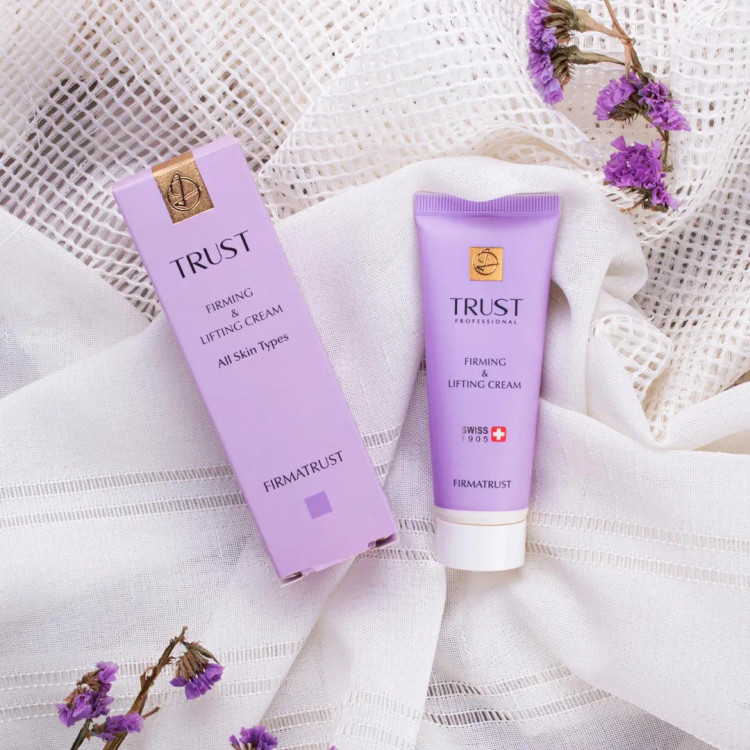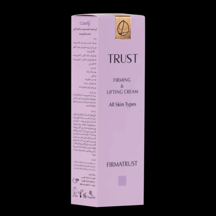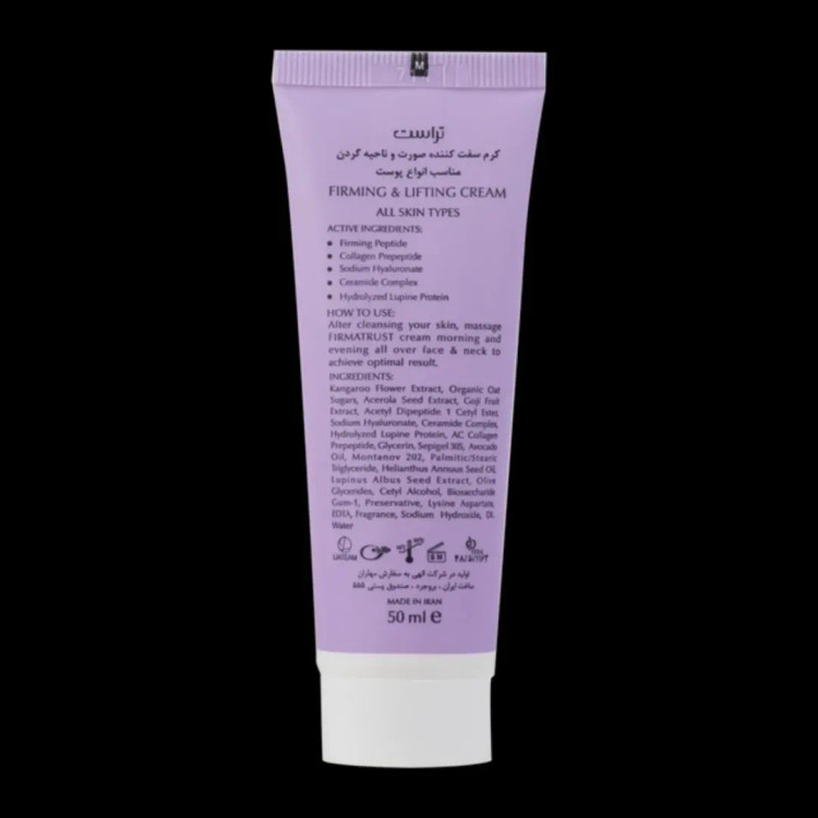 کرم سفت کننده صورت، گردن وسینه تراست با داشتن ترکیباتی مثل عصارههای گل کانگارو، بذر آسرولا، میوه گوجی، آووکادو، بذر آفتابگردان، بذر لوپن سفید و مواد موثره فرمینگ پپتاید، کلاژن، سدیم هیالورونات، کمپلکس سرامید، پروتئین لوپین هیدرولیزشده سفتکننده و بازسازیکننده پوست سرشار از پپتیدهای موثر جهت کاهش افتادگی پوست تحریک ساخت کلاژن و الاستین پوست حفظ طراوت، شادابی و جوانی پوست فاقد پارابن مناسب انواع پوست همه بانوان و آقایان.