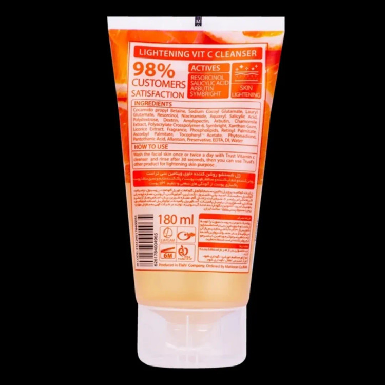 ژل شستشو روشنکننده حاوی ویتامین سی تراست به خاطر داشتن مواد مؤثره ویتامین سی، رزورسینول، سالیسیلیک اسید، آربوتین و سیم برایت، پوست را روشن و شاداب ساخته و از آن محافظت میکند. همچنین این محصول یک پاککننده ملایم و عمیق منافذ پوستی بوده و پوست را از آلودگیهای سطحی پاکسازی کرده و میزان pH پوست را تنظیم میکند.