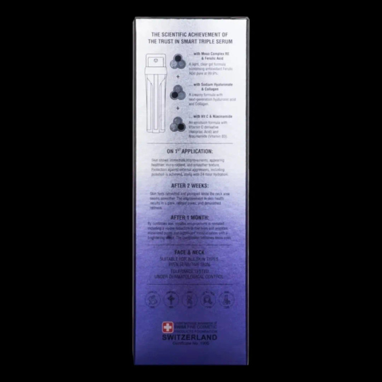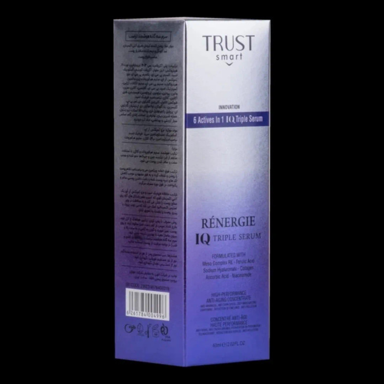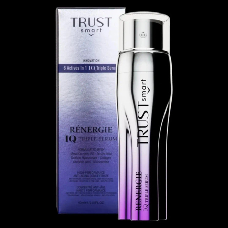 سرم سهگانه هوشمند تراست برای اولین بار به عنوان قویترین محصول حاوی سه نوع سرم روشنکننده، ضد چروک و جوانساز پوست در قالب یک محصول طراحی شده است. سرم روشنکننده حاوی ترکیبات فعال اصلی ویتامین C و نیاسینآمید است که به طور چشمگیری به رفع لکهای پوست و جلوگیری از تیرگی پوست ناشی از عوامل مختلف کمک میکند. این محصول با داشتن ترکیبات فعال فرولیکاسید و مزوکمپلکس آر ای در فرمولاسیون سرم جوانساز خود، توانایی بینظیری برای ساخت سلولهای جدید پوستی و بازسازی و جوانسازی پوست دارد. مزوکمپلکس مورد استفاده در فرمولاسیون این سرم، با داشتن انواع ترکیبات فعال پپتیدی، آمینواسیدها، هیالورونیکاسید، مواد معدنی و انواع ویتامینها، تاثیر منحصر به فردی در بازسازی و جوانسازی پوست دارد. کلاژن و هیالورونیکاسید مورد استفاده در فرمولاسیون سرم ضد چروک هم بعد از استفاده از سرم بر روی پوست تاثیر همافزایی با مزوکمپلکس و فرولیک در آبرسانی، رفع چین و چروکها و افزایش استحکام پوست دارد. بنابراین سرم سهگانه هوشمند تراست با داشتن سه نوع سرم با ترکیبات فعال آبرسان، افزایشدهنده استحکام پوست، جوانکننده و ضد چروک و روشن کننده پوست، به عنوان محصولی متفاوت و بینظیر به بازار معرفی گردید.