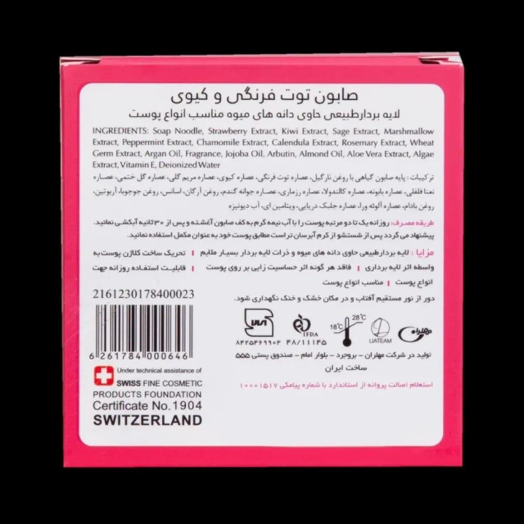 در این محصول جهت اثرگذاری بهتر و بیشتر، ضمن داشتن حس طراوت و شادابی در پوست، از عصارههای خالص توت فرنگی و کیوی کمپانی سیمرایس کشور آلمان به صورت اکستراپن استفاده شده است. ذرات لایه بردار گیاهی در این صابون به گونهای انتخاب شده که لایه برداری ملایمی را بر روی پوست انجام داده به همین دلیل قابلیت استفاده روزانه را داشته و بعد از 2 هفته استفاده، موجب روشن شدن و ایجاد احساس شادابی و جوانی در پوست میشود.