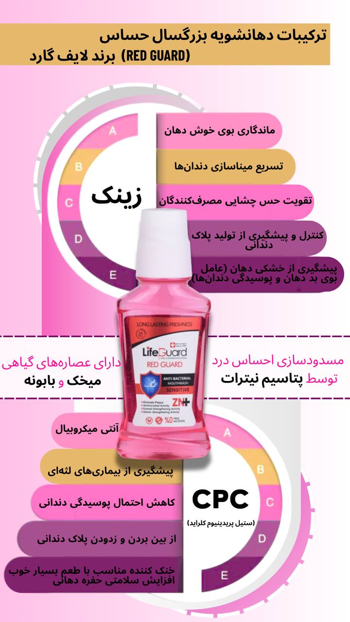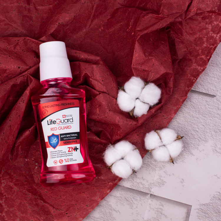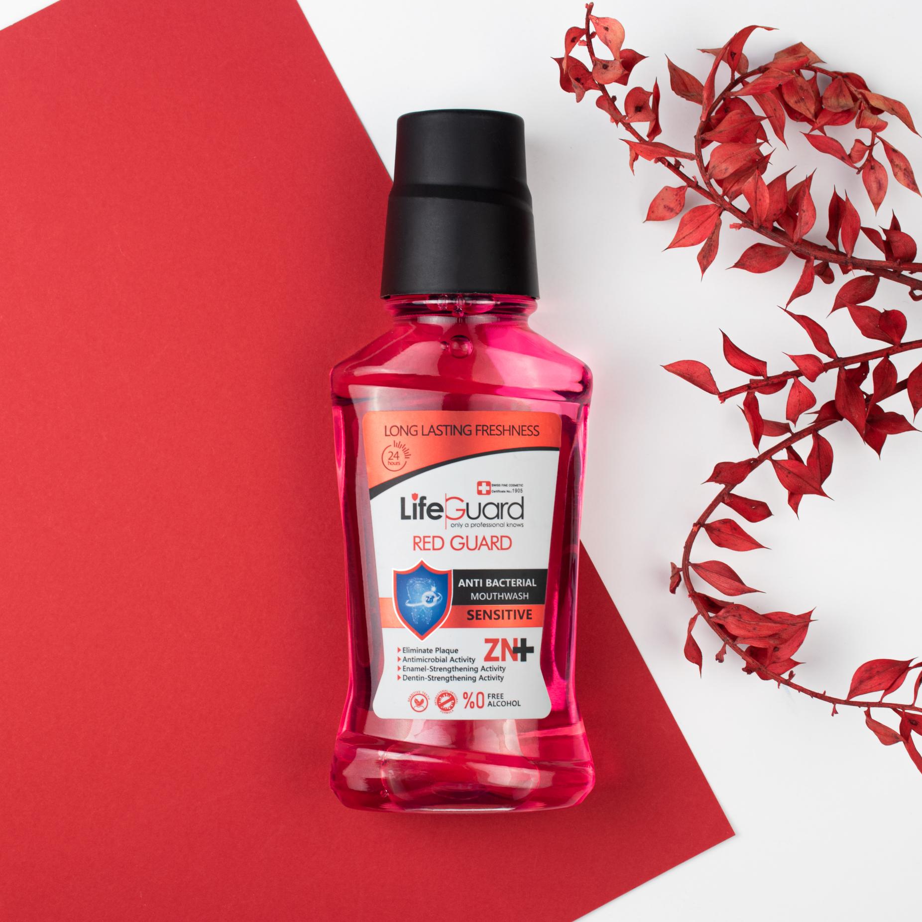دهانشویه بزرگسال حساس (Red Guard) برند لایف گارد، به واسطه بهرهمندی از مواد مؤثرهای همچون زینک و CPC (ستیل پریدینیوم کلراید)، ویژگیهای ارزشمند دیگری را به شرح زیر برای سلامت دهان و دندان شما به ارمغان میآورد: