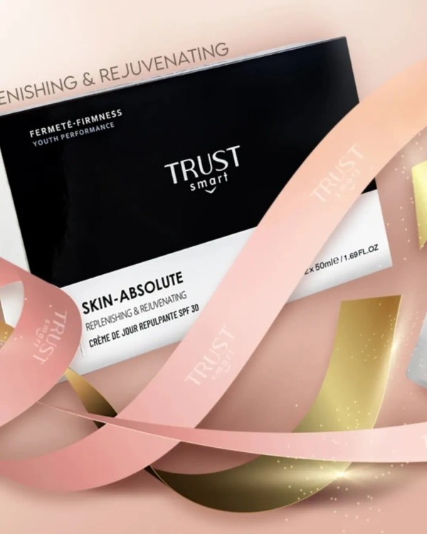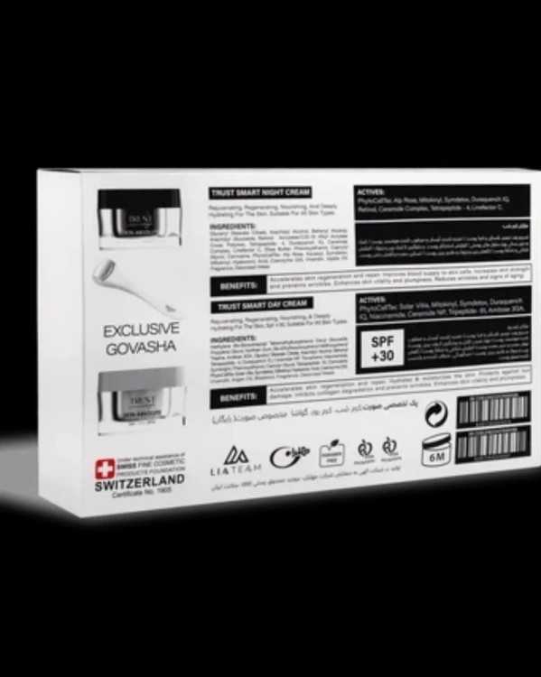 جوان کننده پوست با داشتن ترکیبات فعال پپتیدی، آمیتوز 3GA، Duraquench IQ، عصاره سلول بنیادی دانه انگور، میتوکینیل، ویوندین و کوآنزیم کیوتن افزایش استحکام پوست و رفع چین و چروکهای پوستی با داشتن ترکیبات فعال پپتیدی تتراپپتاید-۴، تتراپپتاید-۶۱، سرامید NP، هیالورونیکاسید و توکوفرول مهار کننده پرتوهای UV و روشنکننده پوست با داشتن ترکیبات فعال آمیتوز 3GA، نیاسینآمید، سیمبرایت، سیمدتوکس و میتوکینیل حاوی ترکیبات فیلتر کننده پرتوهای UV و مراقبت از پوست در برابر این پرتوها با داشتن SPF 30+ تسکیندهنده التهابات پوستی با داشتن ترکیبات فعال ویوندین، نیاسینآمید، روغن آرگان و بیزابولول مواد مؤثره کرم روز تراست اسمارت: